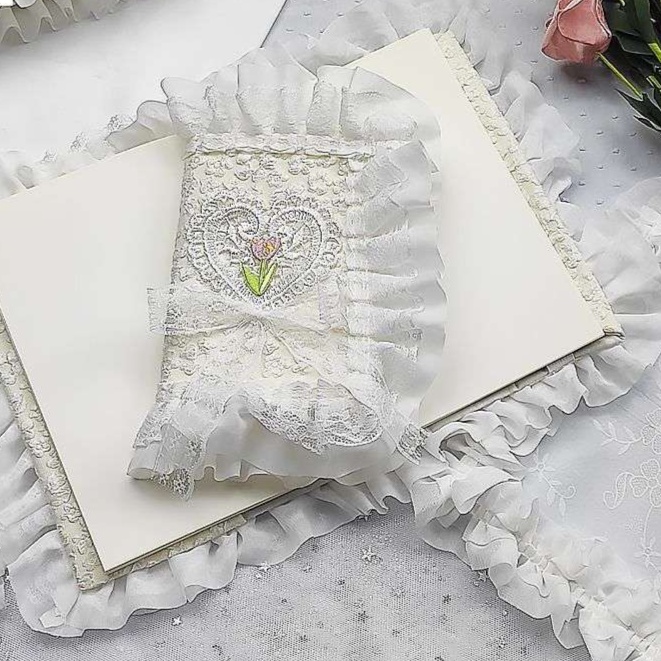 繊細なレースとハート刺繍が施された、エレガントでおすすめのブックカバーです。