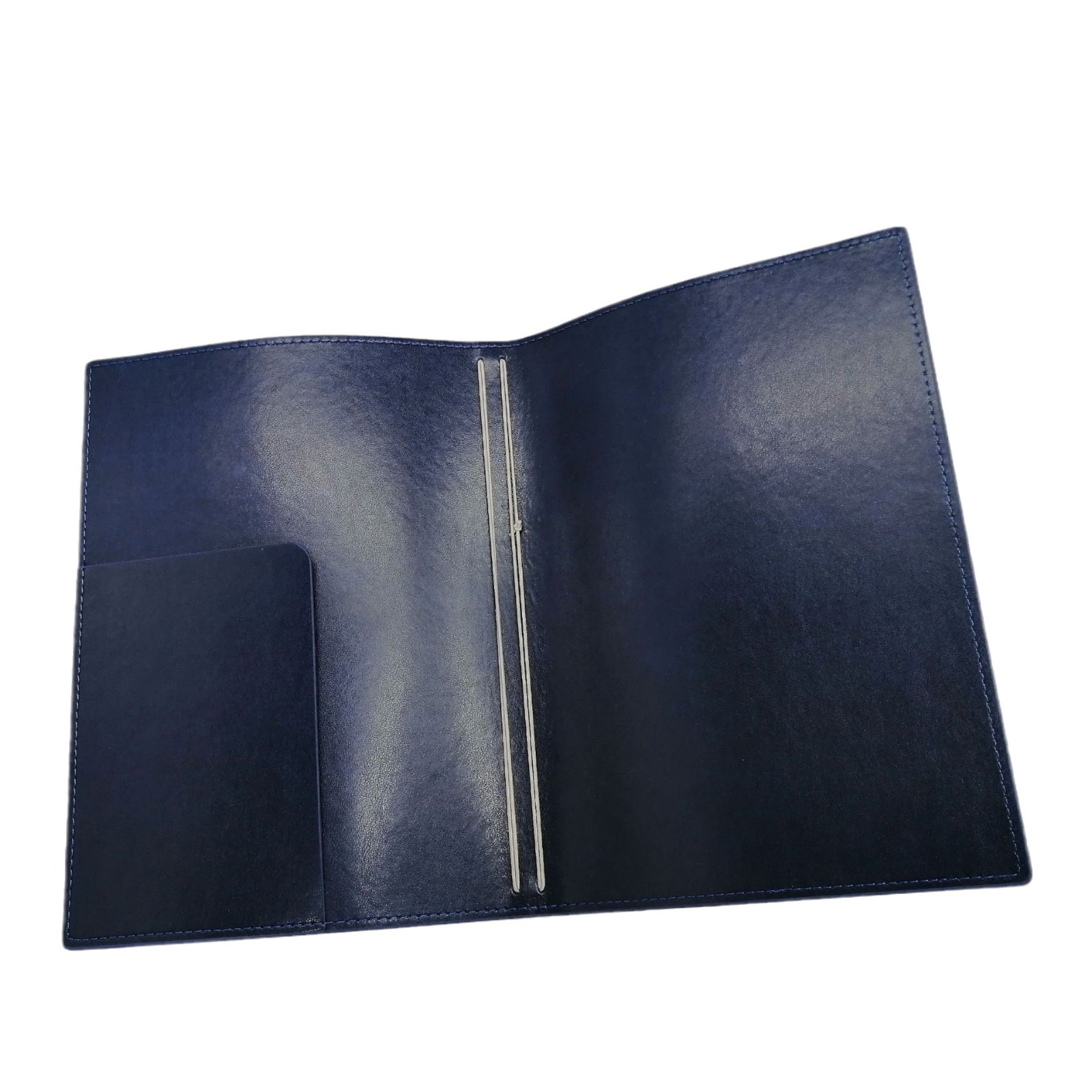 深みのある濃紺が印象的な本革ノートカバーは、ビジネスシーンでの活用に最適な一品です。