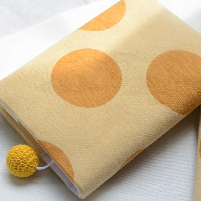 優しいクリーム色の生地に、温かみのあるオレンジ色の大きな水玉模様が特徴的なブックカバーです。