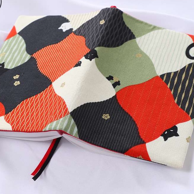 布製ブックカバーで個性を演出。和風パッチワーク柄が特徴的で、幾何学模様と猫のシルエットが織り交ぜられた独特のデザインです。