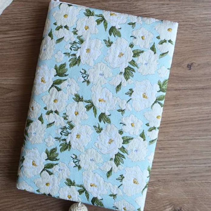 爽やかな色合いに白い花と緑の葉が散りばめられた上品な布製ブックカバーです。繊細な刺繍が施され、柔らかな質感が特徴。かわいい玉付きの栞紐がアクセントになっています。日記や手帳にぴったりの癒しアイテムです。
