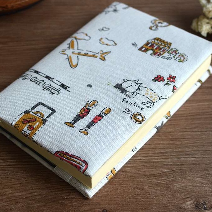 かわいい旅行モチーフのイラストが散りばめられた布製ブックカバーです。飛行機や建物、動物などの絵柄が楽しく、旅の思い出を大切に記録したくなる雰囲気です。しおり紐付きで使いやすく、日記や手帳のカバーに最適です。