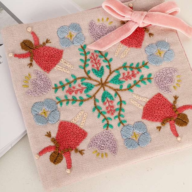 優雅な花と蝶の刺繍が施された布製ブックカバー。 柔らかな素材に施された繊細な刺繍が映え、日々の読書に彩りを添えます。 リボンがアクセントとなり、女性らしさを演出。 大切な本を華やかに包み込む上質なカバーです。